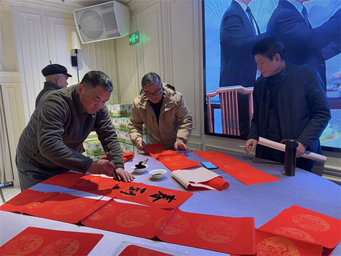 与此同时,一场别开生面的写春联活动也在现场同步进行。这项活动由马鞍山潜川画院精心组织并承办,六名书法家们挥毫泼墨,为与会的会员和嘉宾们写对联送福字二百多幅,大家纷纷驻足观赏,有的被对联的精美书法所吸引,有的则仔细品味着对联中的深意,更有不少工作人员主动向书法家们求取对联,希望将这份吉祥与祝福带回家中,为新的一年增添一份别样的喜庆与温馨。这场写春联活动,成为迎春团拜会中的一道亮丽风景线,让整个活动现场洋溢着浓浓的节日气氛。