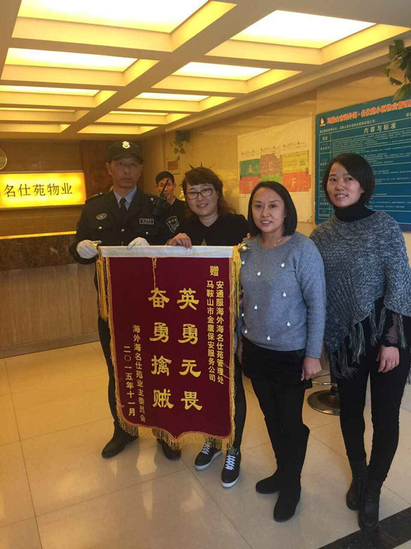 马鞍山庐江商会理事单位金鹰保安公司保安员英勇擒贼,业主送锦旗感谢